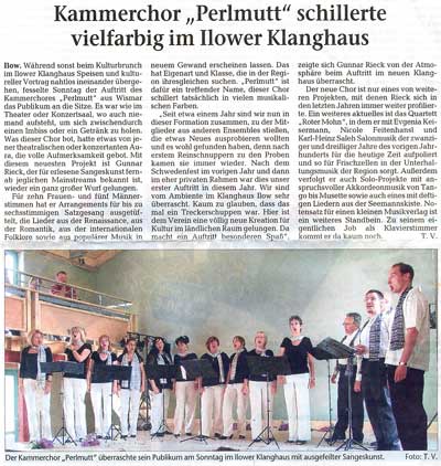 Wismar. "Zwei Länder - zwei Chöre": Ein außergewöhnliches Konzert erlebten etwa 60 Zuhörer am Sonnabendvormittag im Wismarer Rathaus. "Jazz'n others" aus der schwedischen Hauptstadt Stockholm und "Perlmutt" aus Wismar sangen im Bürgerschaftssaal. Als "kleinen Chorkampf" bezeichnete - mit Augenzwinkern - Alf Benavente die fröhliche, kurzweilige Veranstaltung. Der Schwede, der in Wismar wohnt und einst bei "Perlmutt" sang, hatte das Treffen im Namen der deutsch-schwedischen Gesellschaft der Hansestadt Wismar organisiert. Der Kammerchor "Perlmutt", 2007 gegründet, die Leitung hat Gunnar Rieck (45), begeisterte mit Liedern in deutscher, englischer und schwedischer Sprache, darunter auch Klassiker der Musikgeschichte. Die zehn Sängerinnen und Sänger von "Jazz'n others" brachten, von Per-Olof Losvall (65) am Keyboard begleitet, unter anderem ABBA-Songs zu Gehör.